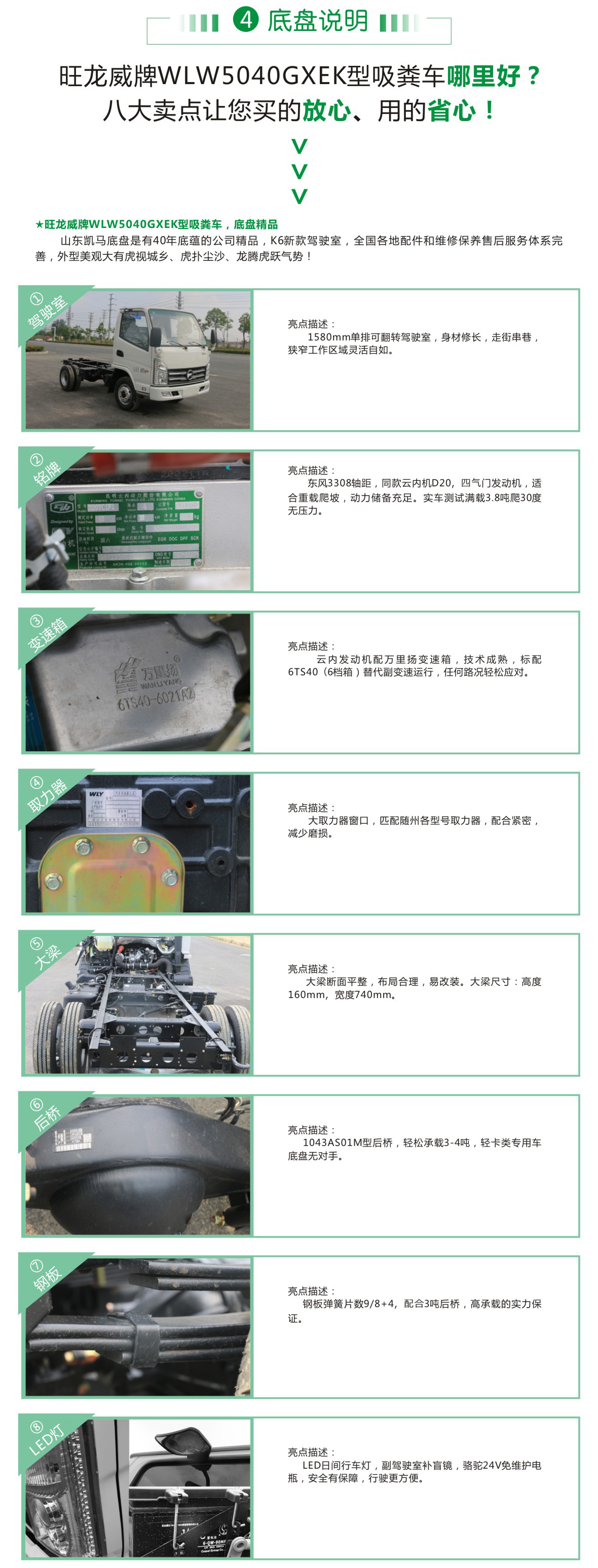 ①底盤:旺龍威牌WLW5040GXEK型吸糞車的發動機是大馬力發動機