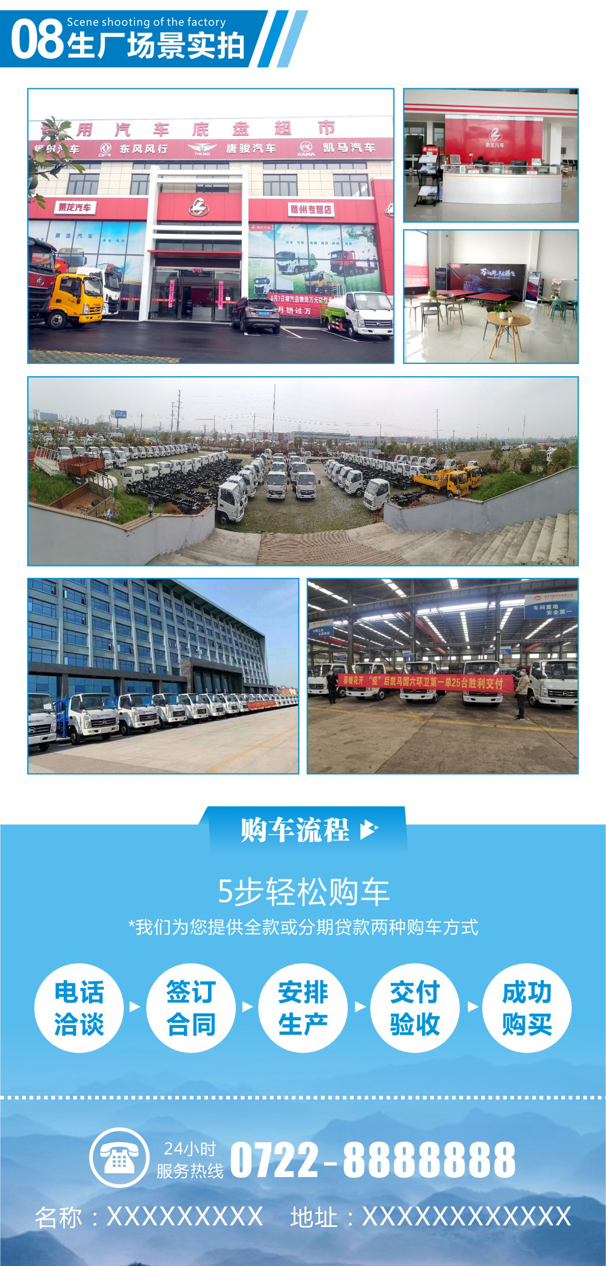 第五步交付方式:客戶可自提已確定的車輛型號,也可協商由我公司安排送車并協定相關費用,更多詳細訂車流程請來電咨詢!